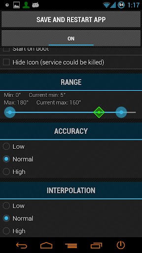 When you are using your device, you hold it in a specific position. Keep Screen ON let you select the range of activation of the screen brightness based on the device inclination (more smart ways are coming soon).